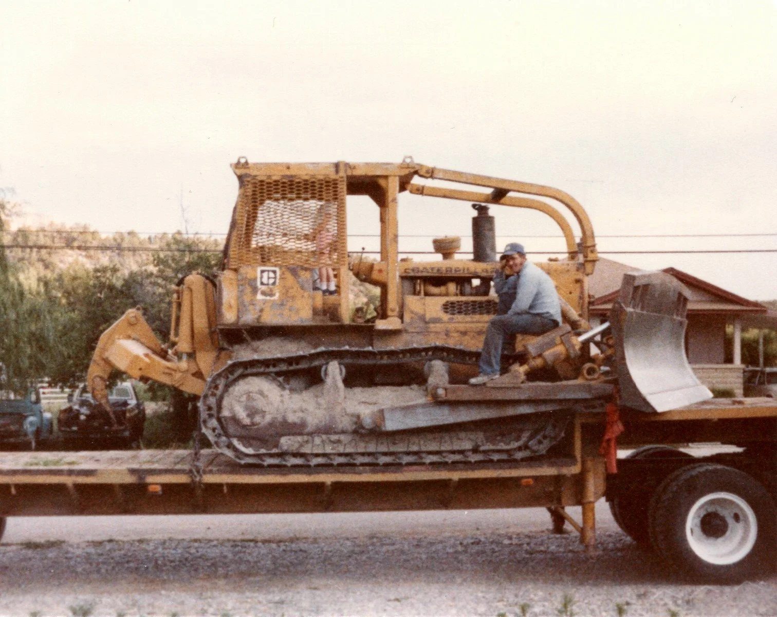 Larry Rose watching his kids explore the Cat Dozer, 1985.